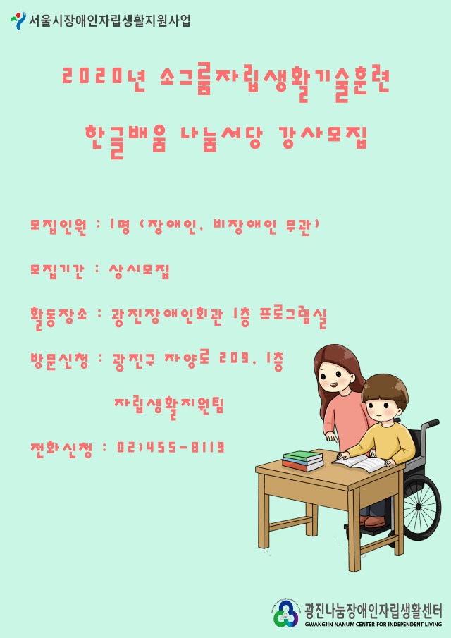 2020년 소그룹자립생활기술훈련 한글배움 나눔서당 강사 모집 안내 관리자 0 698 2020.05.06 10:59 2025.02.18 06:11 나눔서당_강사지원서.hwp (116.5K) + 16 한글배움나눔서당 강사모집안내 대상:장애인, 비장애인 무관 문의:02-455-8119 자립생활지원팀