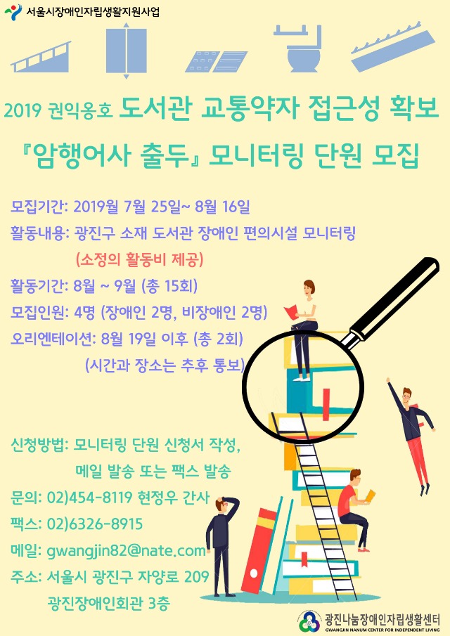 도서관 교통약자 접근성 확보 『암행어사 출두』모니터링 단원 모집 관리자 0 688 2019.07.25 14:59 2025.02.18 06:11 모니터링 참가신청서_서식.hwp (102.5K) + 19 -신청: 8월16일 까지 / 전화문의: 02) 454-8119 (담당: 현정우 간사)