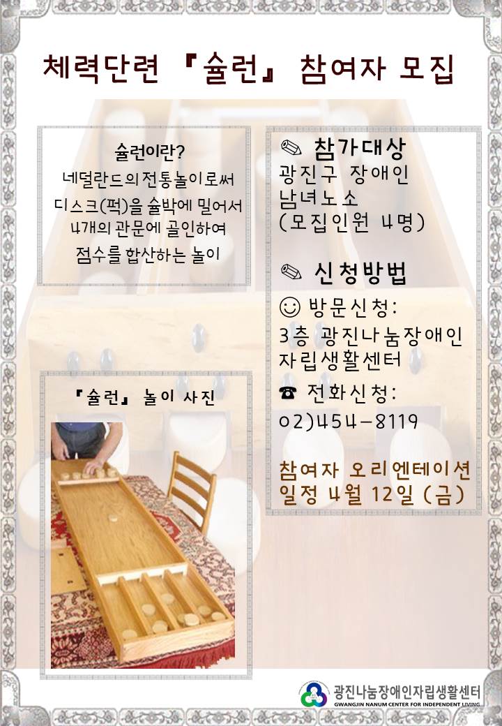 소그룹자립생활기술훈련 체력단련 『슐런』 참여자모집 관리자 0 787 2019.03.26 17:44 소그룹자립생활기술훈련 체력단련 『슐런』 참여자모집 -신청: 4월10일 까지 / 전화문의: 02) 454-8119 (담당: 현정우 간사)