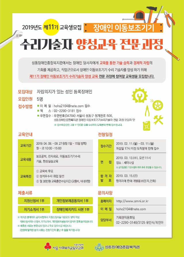 이동보조기기 수리기술자 양성교육 전문과정 교육생 모집 관리자 0 786 2019.02.07 18:23 2025.02.18 06:11 [모집요강]이동보조기기수리기술자양성교육-2019.pdf (213.9K) + 30 2025.02.18 06:11 [지원신청서]2019장애인이동보조기기수리기술자양성교육.hwp (156.0K) + 27 이동보조기기수리기술자양성과정 교육 입학식: 4/8(월, 예정) 기타 문의사항은 02-2290-3125로 전화 바랍니다.