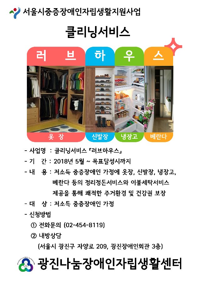 [러브하우스 클리닝서비스] 참여자 모집 안내 관리자 0 772 2018.05.03 15:12 2025.02.18 06:11 서비스신청서및정보제공동의서.hwp (151.5K) + 26 2018년 광진나눔장애인자립생활센터에서는 서울시중증장애인자립생활지원 사업의 일환으로 저소득층 중증장애인의 가정에 정리정돈 및 쾌적한 주거환경 클리닝 서비스를 제공합니다. 1. 기간 : 5월 ~ 11월 2. 내용 : 옷장, 냉장고, 베란다 청소 등 정리정돈 서비스 이불세탁서비스 3. 인원 : 1가정 4. 신청 : 신청서 작성 후 내방 또는 전화상담 (02-454-8119)
