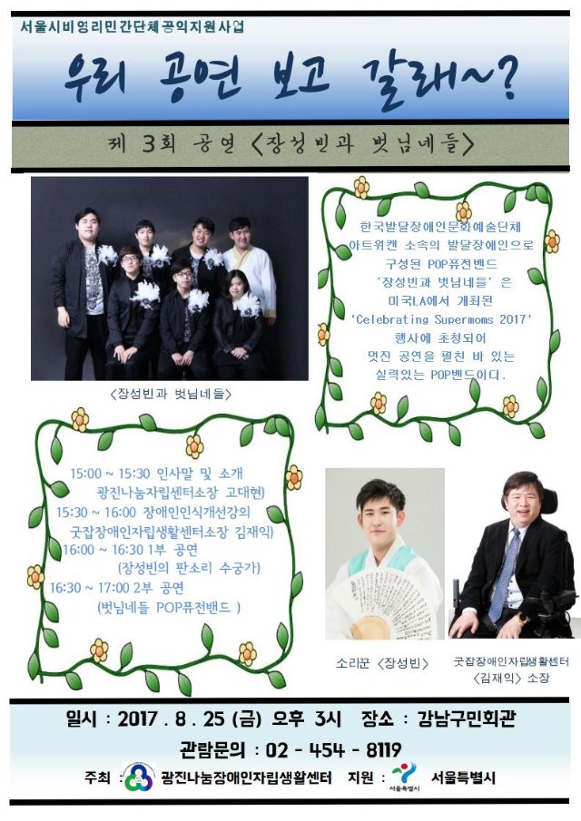 발달장애인 장성빈 판소리 공연 및 벗님네들 팝 공연 김주형 0 849 2017.08.09 09:31 발달장애인 장성빈 판소리 공연 및 벗님네들 팝 공연 서울시비영리공익활동지원사업으로 발달장애인들이 펼치는 판소리 와 팝의 콜라보레이션 공연이 열린다. 일 시 : 2017년 8월 25일 (금) 오후 3시 장 소 : 강남구민화관 강당 (3호선 대치역 6번출구 100m) 프로그램 1 부 - 장애인식개선강의 (굿잡장애인자립생활센터 김재익 소장) 2 부 - 발달장애인 장성빈 판소리 한마당 3 부 - 발달장애인 퓨전밴드 『벗님네들』팝 공연 입장료 : 무료 관람문의(단체) : 454 - 8119