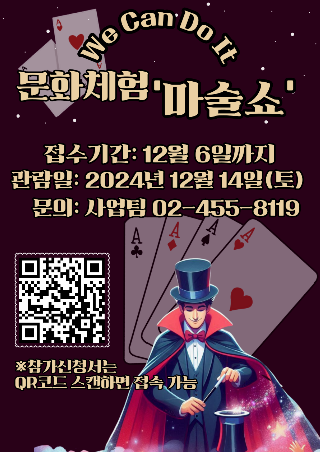 2024년 문화체험「We Can Do It」 마술쇼 관람 참가자 모집 안내 관리자 0 518 2024.11.27 15:30 안녕하세요.광진나눔장애인자립생활센터입니다.2024년 문화체험「We Can Do It」마술쇼 관람 참가자를 모집합니다.1. 신청기간: ~12월 6일 까지2. 대상자: 서울시 거주 장애인 당사자 3. 신청방법: 홍보지 이미지 속 QR 접속 혹은 링크 접속 후 구글폼작성 (https://forms.gle/DQD949QvTbaQwzUE9)4. 문의: 사업팀 02-455-8119(전화)