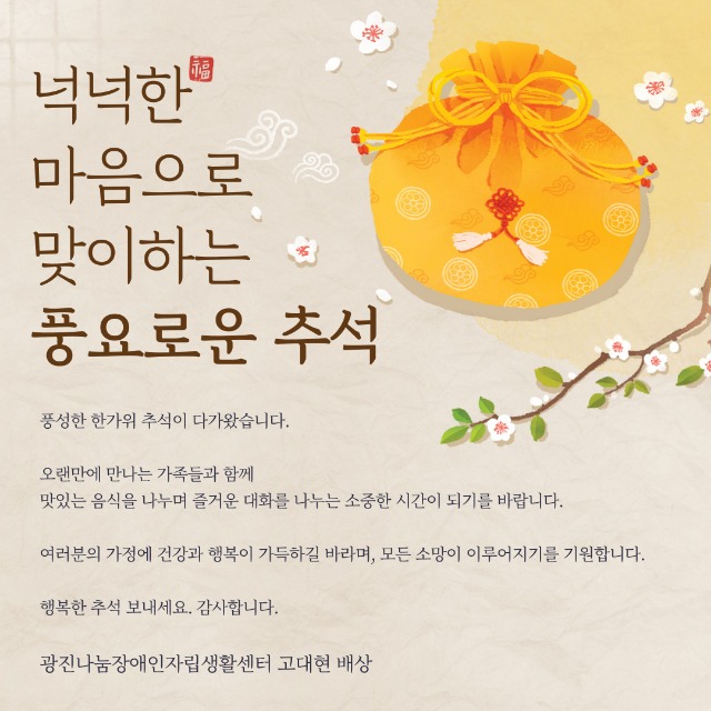 행복한 추석 보내세요. 관리자 0 558 2024.09.12 16:26 넉넉한 마음으로 맞이하는 풍요로운 추석 풍성한 한가위 추석이 다가왔습니다. 오랜만에 만나는 가족들과 함께 맛있는 음식을 나누며 즐거운 대화를 나누는 소중한 시간이 되기를 바랍니다. 여러분의 가정에 건강과 행복이 가득하길 바라며, 모든 소망이 이루어지기를 기원합니다. 행복한 추석 보내세요. 감사합니다. 광진나눔장애인자립생활센터 고대현 배상