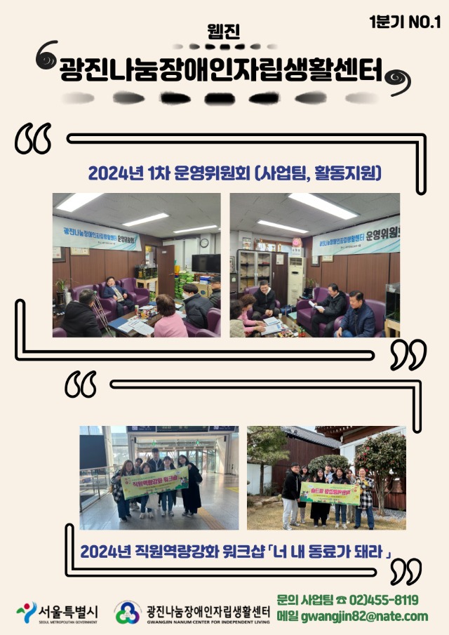 2024년 1~3분기 웹진 관리자 0 544 2024.10.23 15:08 광진나눔장애인자립생활센터 1~3분기 사업과 소식을 담은 웹진이 발행되었습니다. 4분기 광진나눔의 사업에도 많은 관심 부탁드립니다.