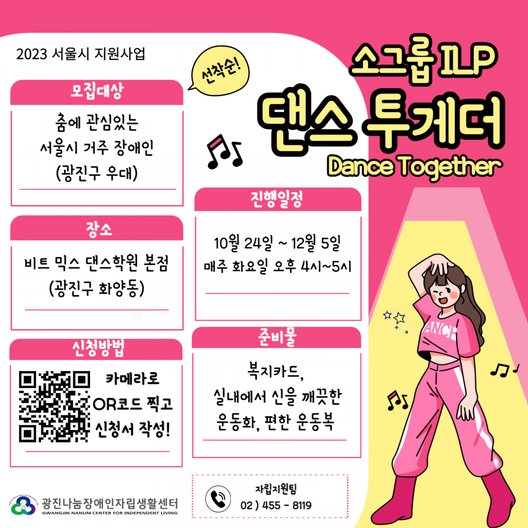 2023년 소그룹ILP-함께하는 ILP '댄스투게더' 추가 모집 관리자 0 801 2023.10.12 11:11 현재 진행되고 있는 '함께하는 ILP, 댄스투게더' 참가자를 추가로 모집하고 있습니다. 10월 20일 금요일까지 신청 바랍니다. 신청서 : https://forms.gle/3GYJb8kGWvmrUTgN7 문의 : 02)455-8119 자립생활지원팀 간사 강하은