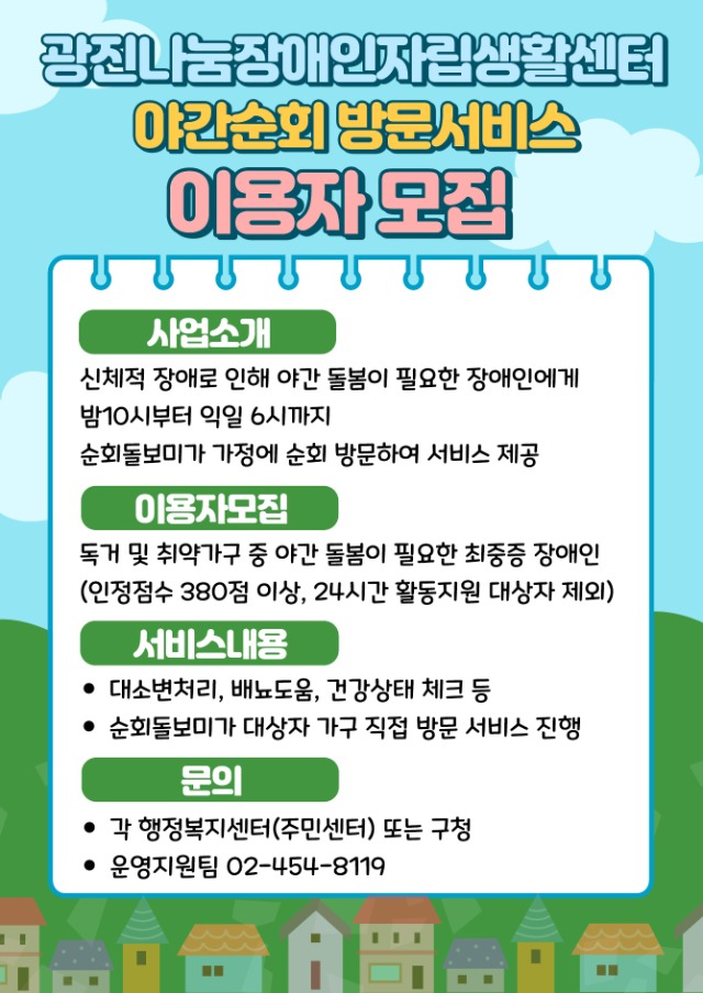 야간순회방문서비스를 소개합니다! 관리자 0 797 2023.03.31 19:49 야간순회방문서비스를 소개합니다! [사업소개] 신체적 장애로 인해 야간 돌봄이 필요한 장애인에게 밤10시부터 다음날 6시까지 순회돌보미가 가정에 순회 방문하여 서비스 제공 [이용자모집] 독거 및 취약가구 중 야간 돌봄이 필요한 최중증 장애인 (인정점수 300점 이상, 24시간 활동지원 대상자 제외) [문의] - 거주지 관할 구청 또는 행정복지센터(구. 주민센터, 동사무소) - 운영지원팀: 02-454-8119