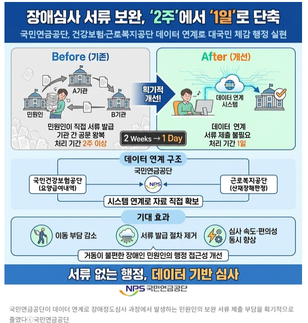 【에이블뉴스 이슬기 기자】국민연금공단이 데이터 연계로 장애정도심사 과정에서 발생하는 민원인의 보완 서류 제출 부담을 획기적으로 줄였다. 기존에 2주 이상 걸리던 자료 확보 기간을 1일로 단축한 것.