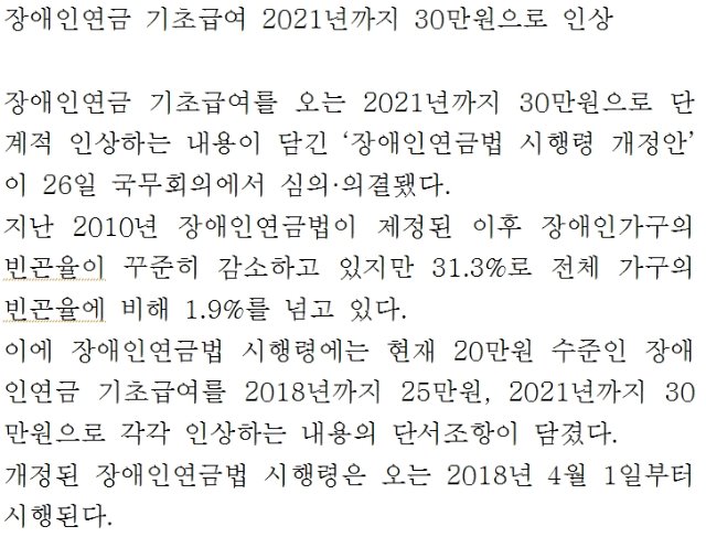 장애인연금 기초급여 2021년까지 30만원으로 인상