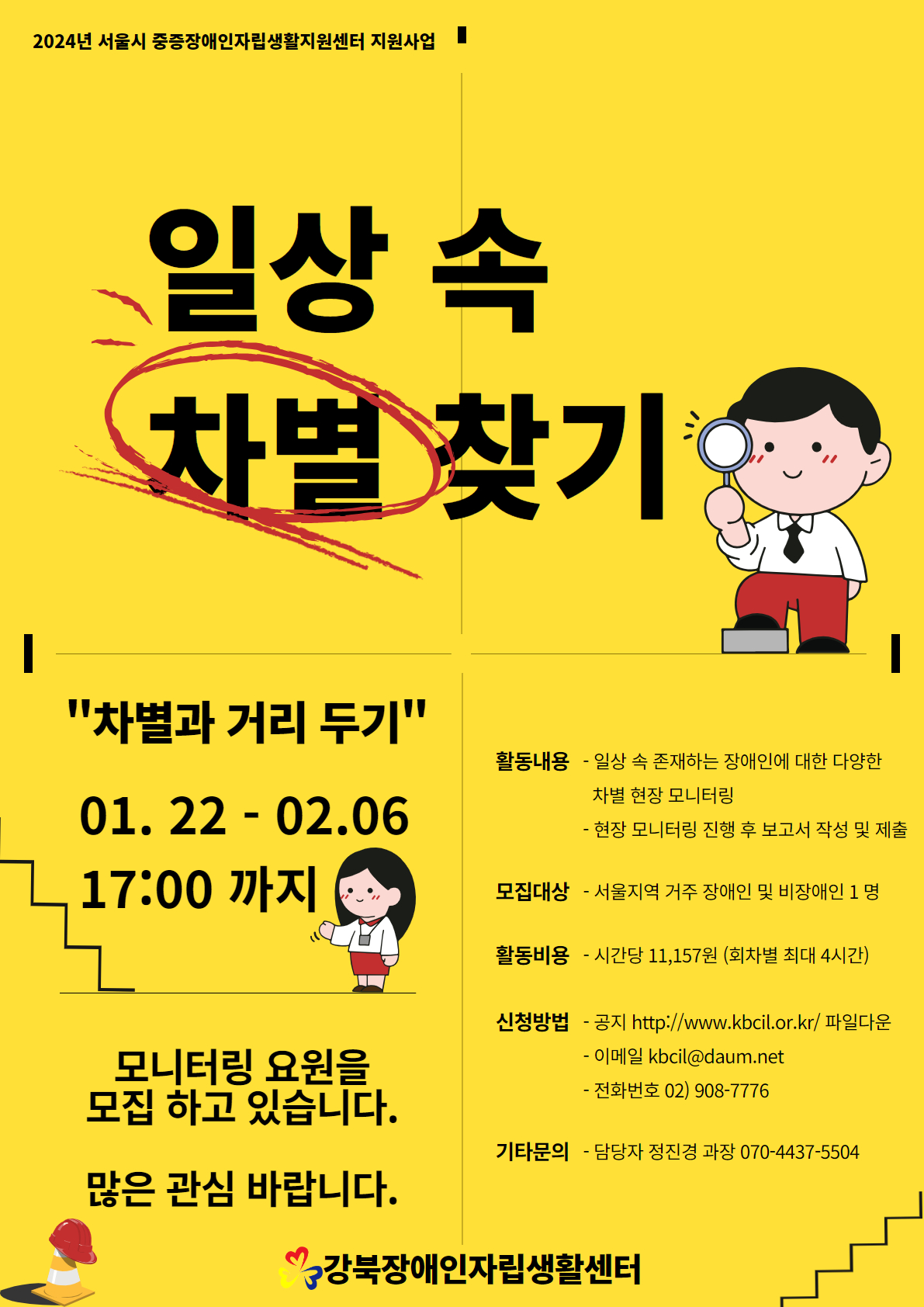 [모집] 2024년 일상 속 차별 찾기 '차별과 거리두기' 모니터링 요원을 모집합니다. 강북센터 0 560 2024.01.24 13:16 http://kbcil.or.kr/?c=user&mcd=community_notice&me=bbs_detail&idx=8119 + 215 2025.02.18 05:24 [강북CIL] 2024년일상 속 차별 찾기 홍보글_신청서최종 1.hwp (70.5K) + 6 많은참여 바랍니다.