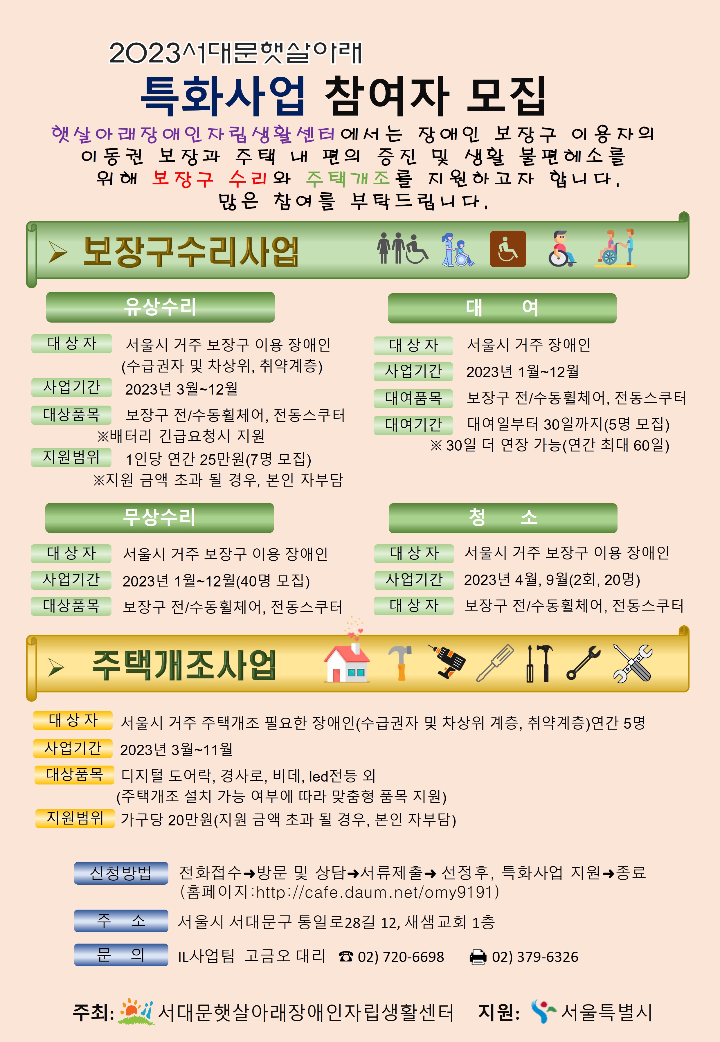 2023년 서대문햇살아래 특화사업 참여자 모집 서대문햇살아래 0 500 2023.02.23 15:47 특별사업 참여자 모집 햇살아래장애인자립생활센터에서는 장애인 보장구 이용자의 이동권 보장과 주택 내 편의 증진 및 생활 불편해소를 위해 보장구 수리와 주택개조를 지원하고자 합니다.