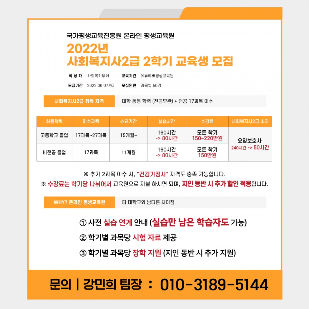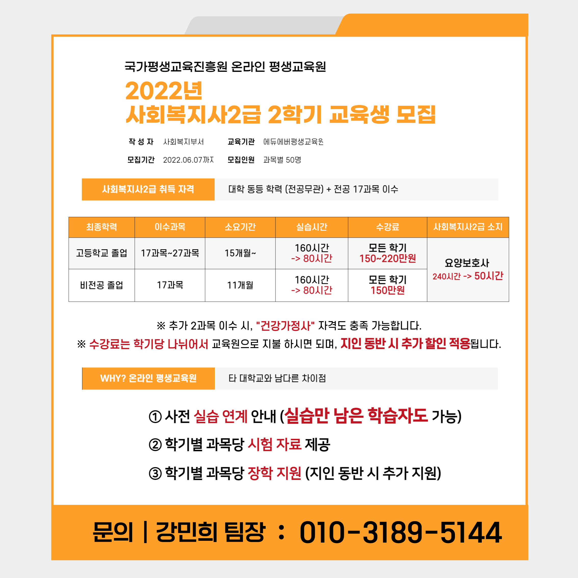 [실습 80시간 면제] 사회복지2급, 마지막 2학기 상시 모집