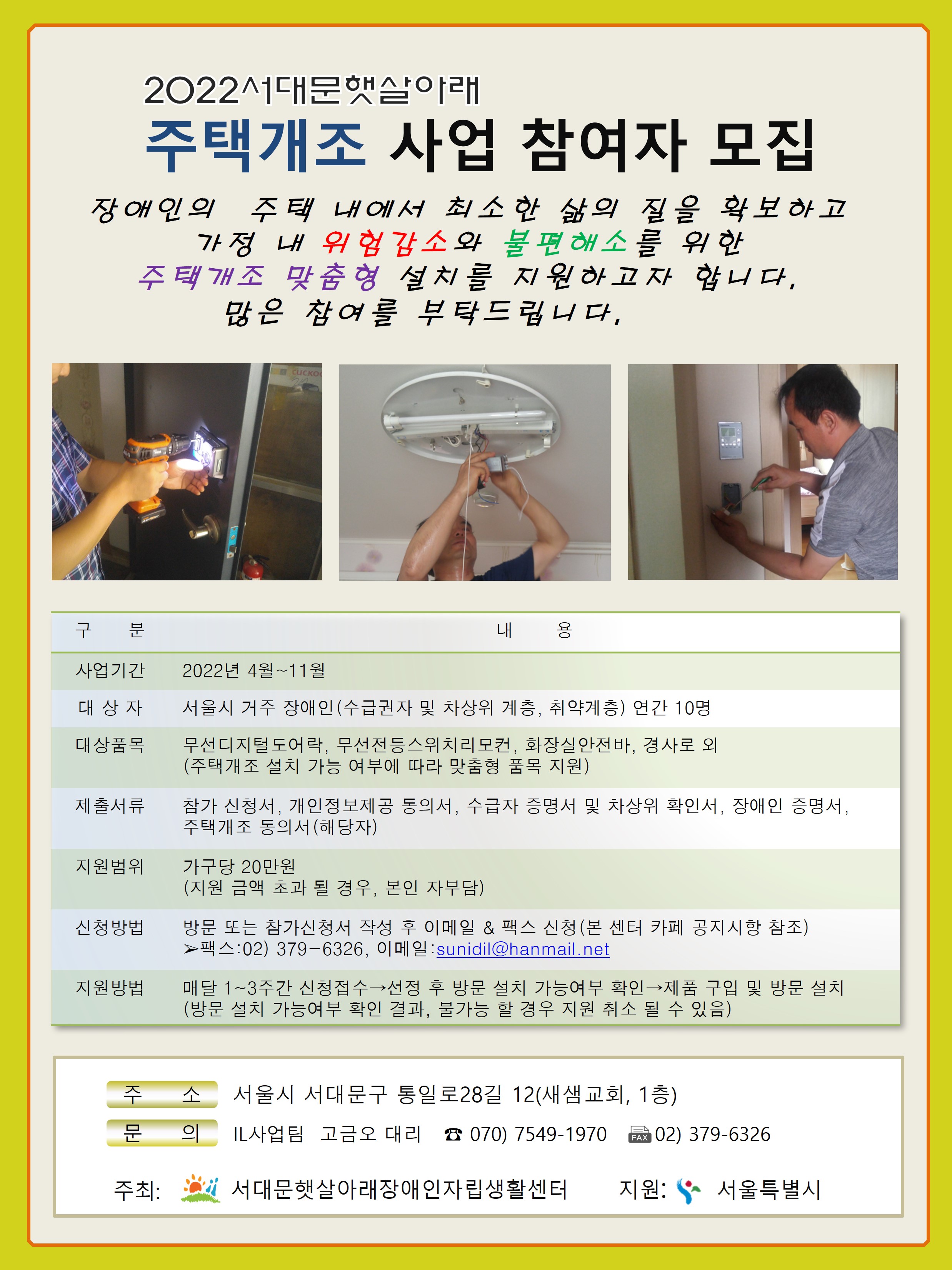2022년 서대문 햇살아래장애인자립생활센터에서 주택개조 지원 프로그램 서대문햇살아래 0 460 2022.03.24 16:39 2025.02.18 05:24 2022년 주택개조--_ 참가신청서.hwp (59.0K) + 8 코로나19 인한 육체적,정신적 고통이 있어 힘들어 입니다. 여러움을 이겨내길 바라며 주택개조지원을 받아 하도록 적주적으로 희망하고 합니다 많이과 잠여 부탁드립니다
