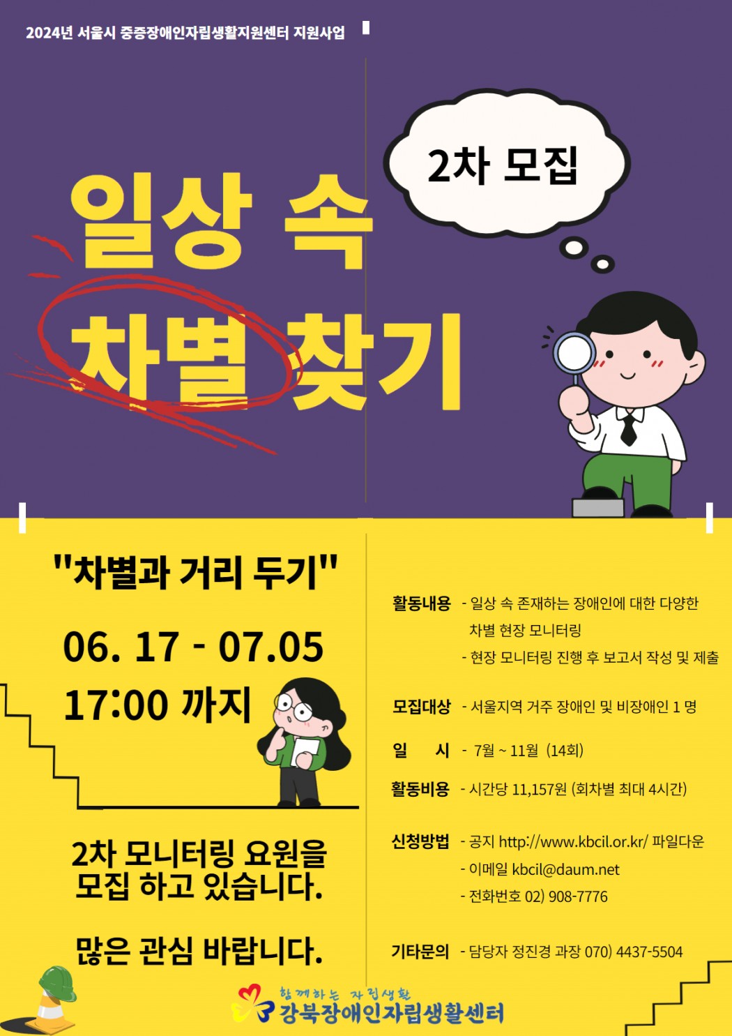 [강북CIL] 2024년 일상 속 차별 찾기 '차별과 거리두기' 모니터링 요원을 2차 모집합니다.