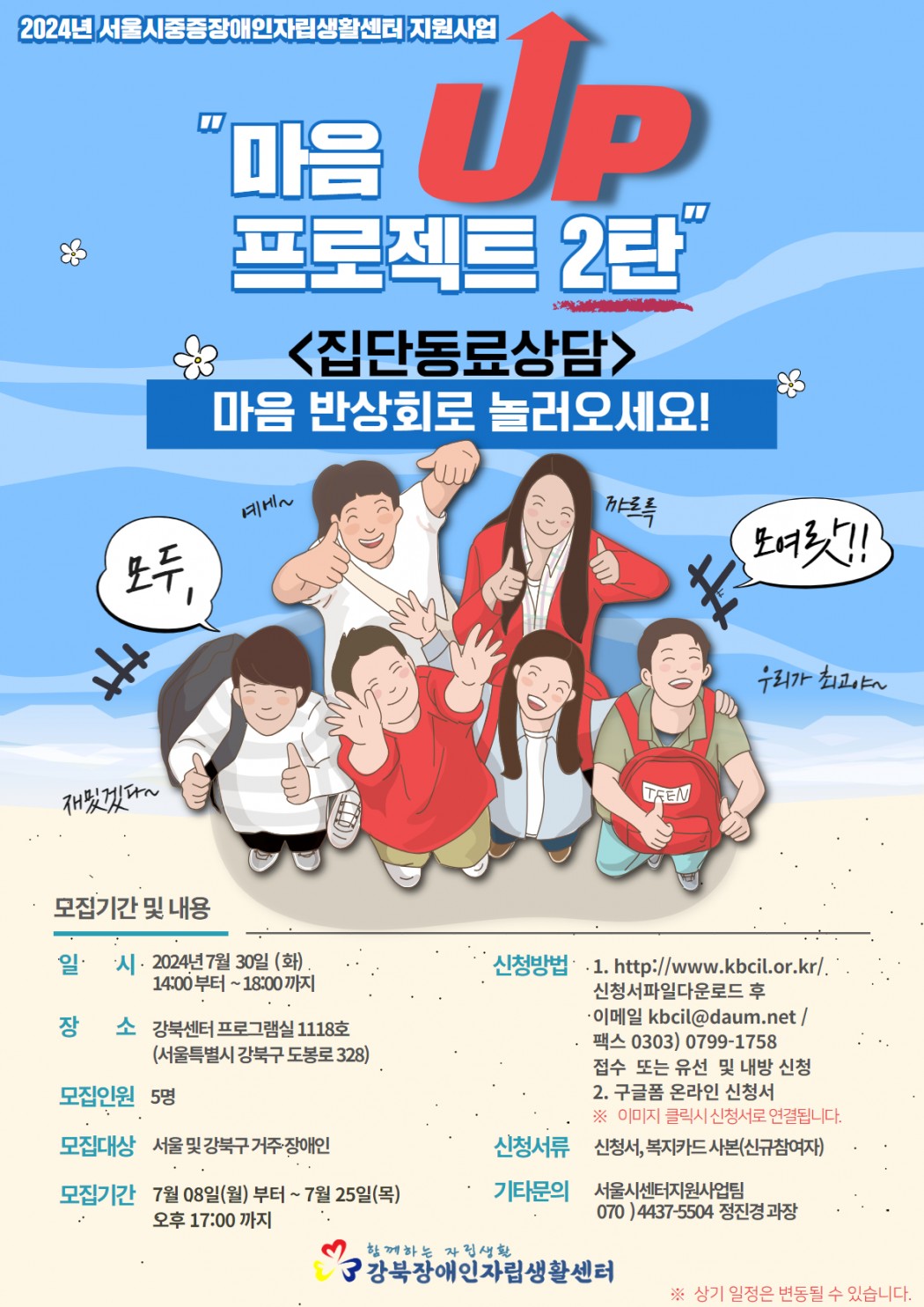 [모집] 2024년 상반기 집단동료상담 ‘마음 반상회’ 참여자 모집합니다. 강북센터 0 577 2024.07.08 14:31 http://kbcil.or.kr/?c=user&mcd=community_notice&me=bbs_detail&idx=8230 + 203 링크를 클릭해주시면 센터 홈페이지로 넘어갑니다.