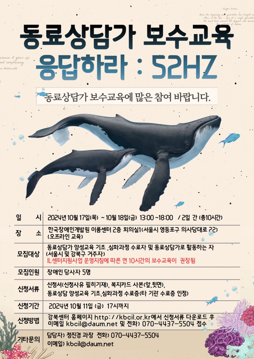 [모집] 2024년 동료상담가 보수교육‘응답하라:52Hz’참여자 모집 강북센터 0 570 2024.09.25 10:22 https://forms.gle/vHQfM5uzFRfLmmJn6 위 링크 클릭 시 센터 홈페이지로 넘어갑니다.