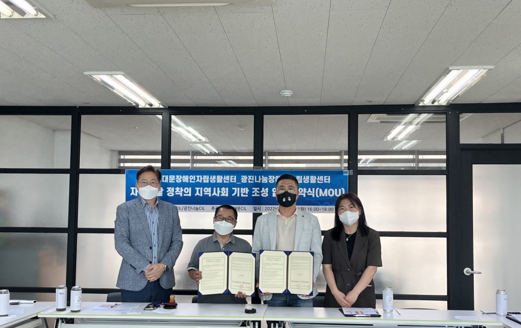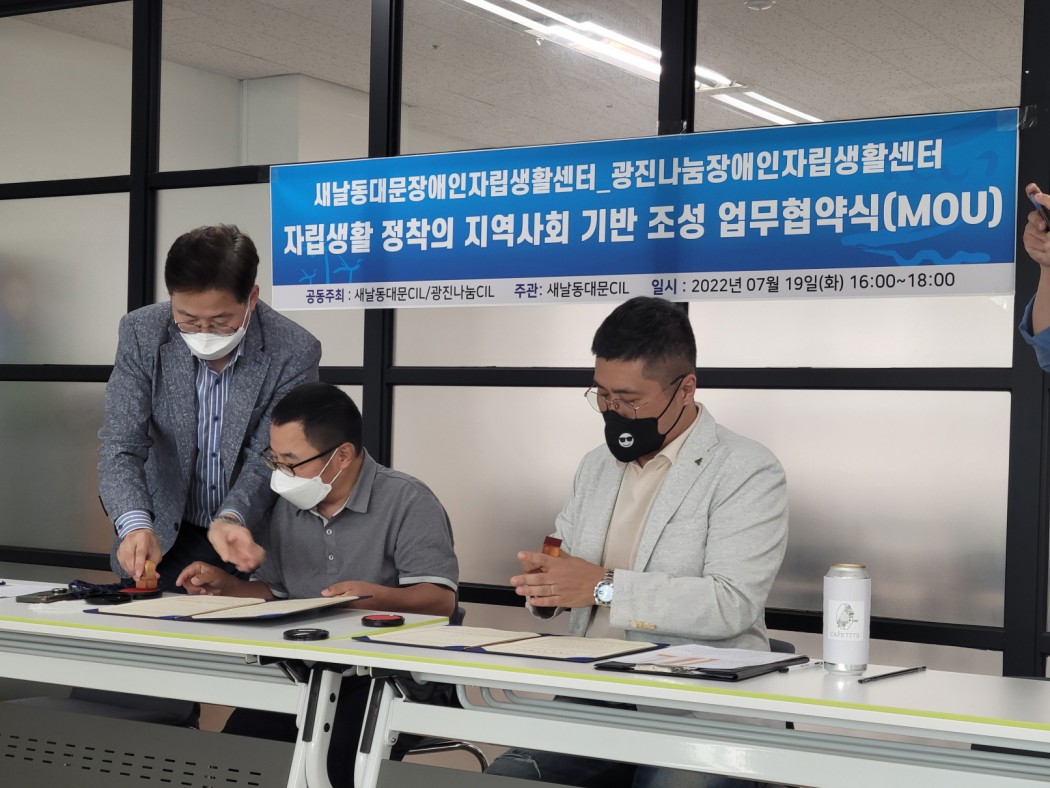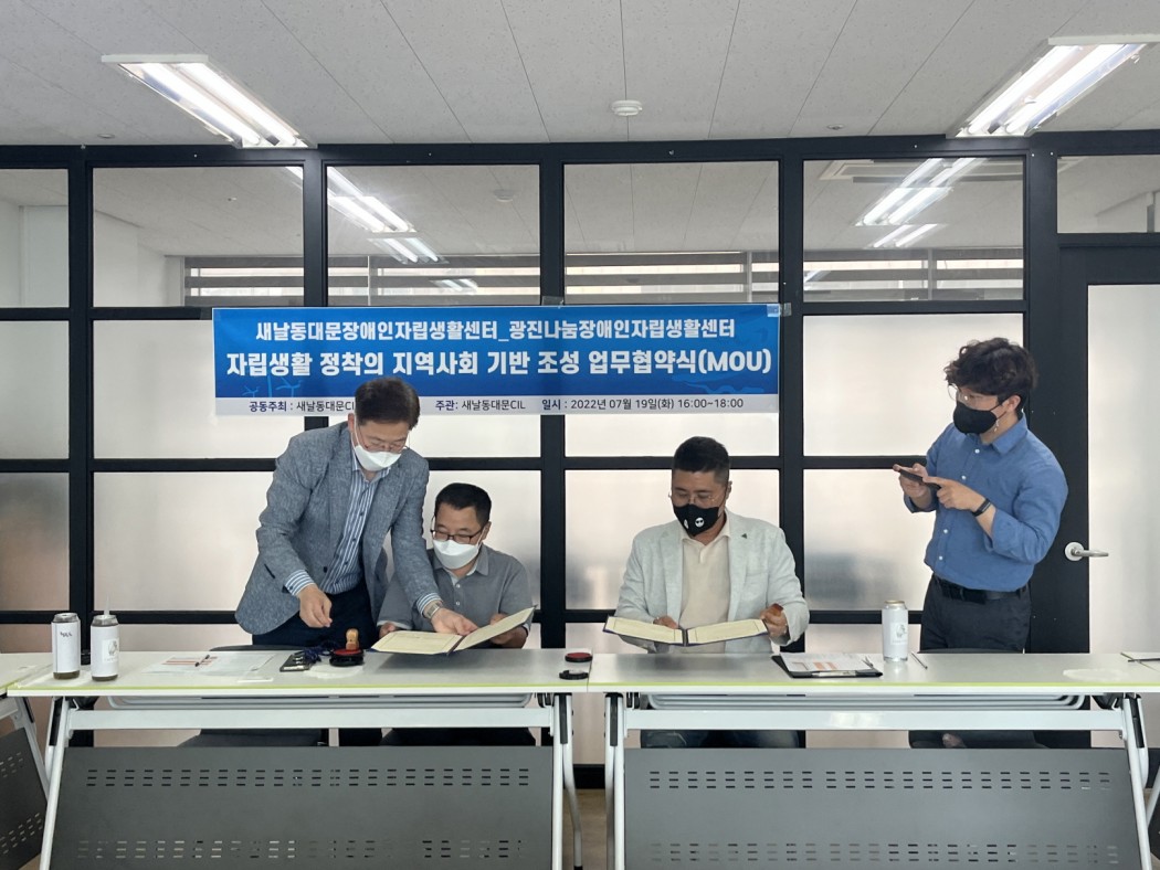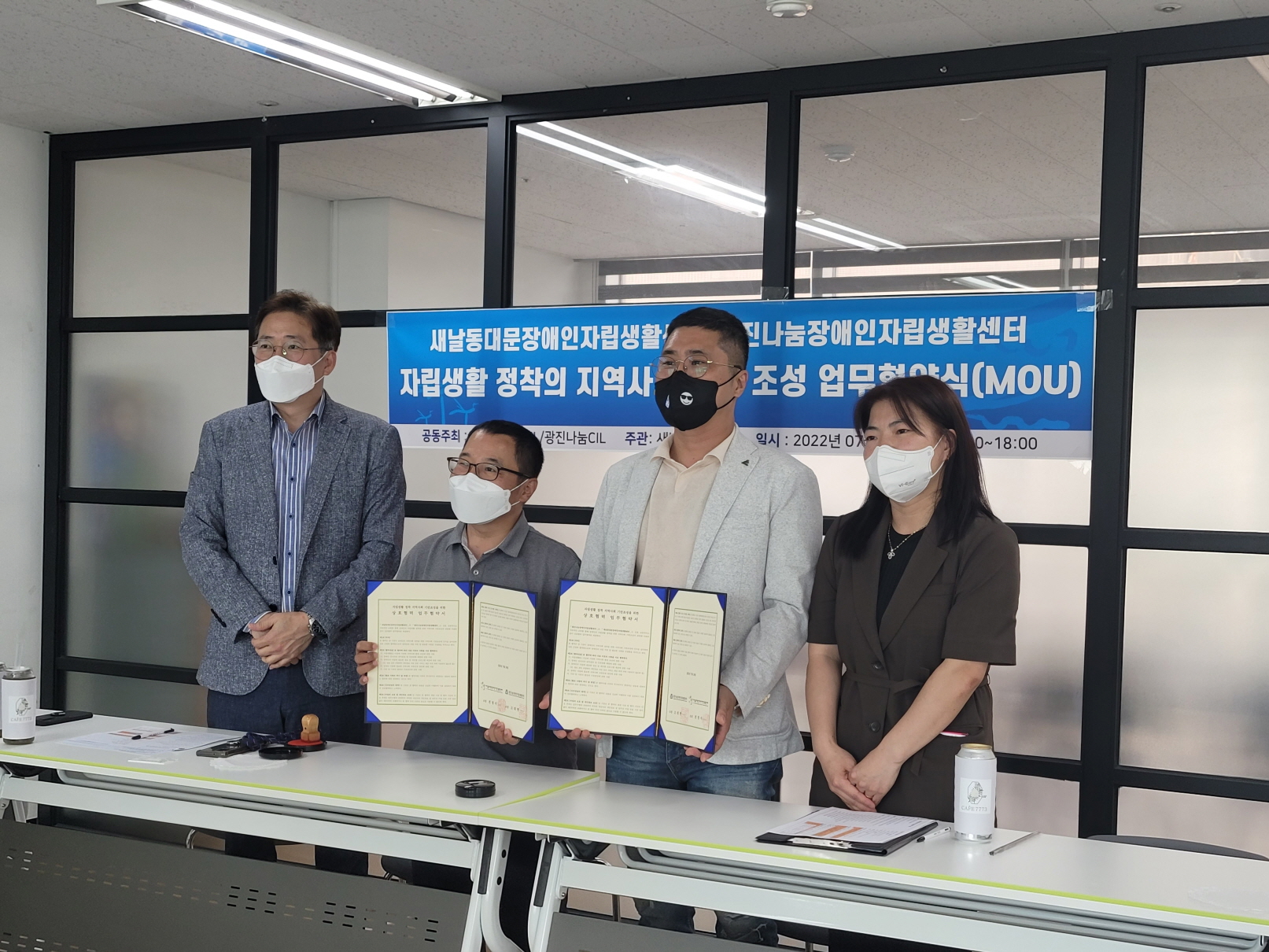 자립생활 정책의 지역사회 기반 조성 업무협약식(MOU) 관리자 0 533 2022.07.21 19:18 저희 광진나눔장애인자립생활센터가 새날동대문장애인자립생활센터와 '자립생활 정착의 지역사회 기반 조성 업무협약식(MOU)'를 진행하였습니다. 업무협약식을 통해 저희 광진나눔장애인자립생활센터가 더욱 발전하는 계기가 되었습니다. 새날동대문자립생활센터 에게 감사의 말씀을 전합니다. 감사합니다