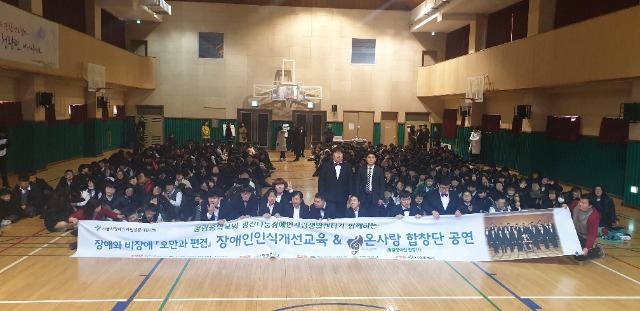 12/12 장애인식개선공연<온사랑합창단>- 청량중학교 관리자 0 524 2019.12.13 11:09 <장애와 비장애 『오만과 편견』> 장애인식개선교육 & 온사랑합창단 공연 2019년 12월 12일, 청량중학교 재학생을 대상으로 장애인식개선 공연 및 교육을 진행하였습니다. 발달장애인과 보호자로 구성된 온사랑합창단이 공연을 맡아 멋진 무대를 보여주었고 청량중 학생들의 반응도 뜨거웠습니다. 앞으로도 장애인에 대한 인식 개선을 위해 고민하고 행동하는 광진나눔이 되겠습니다.