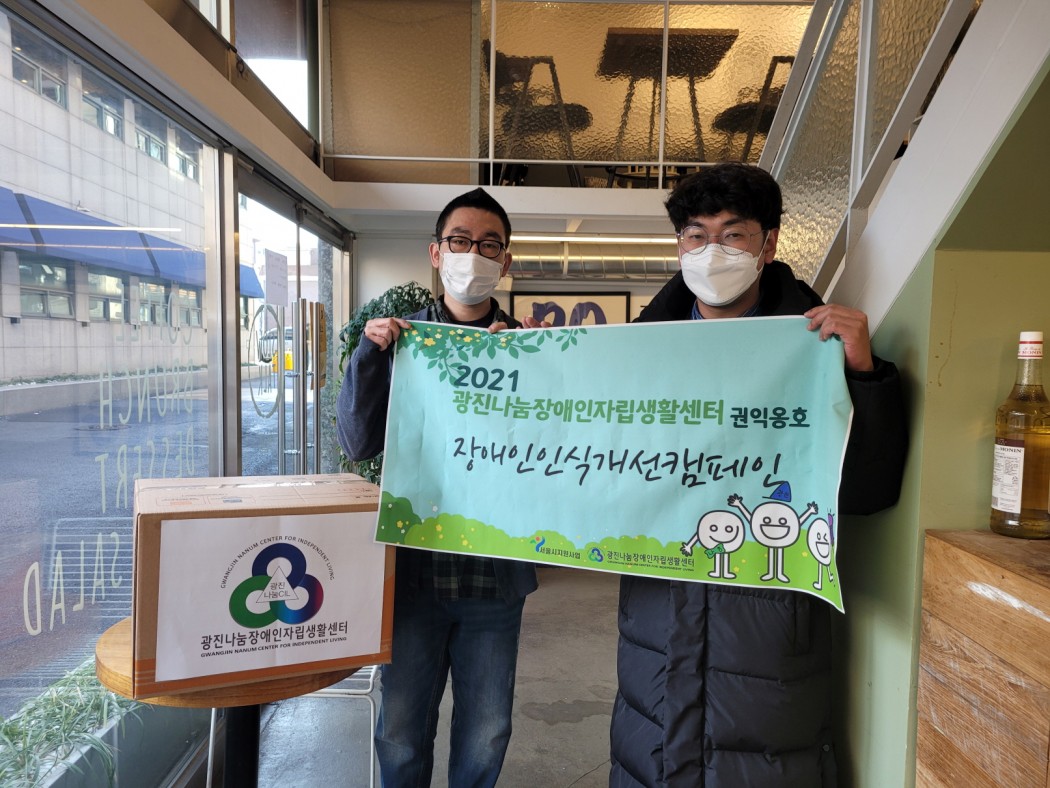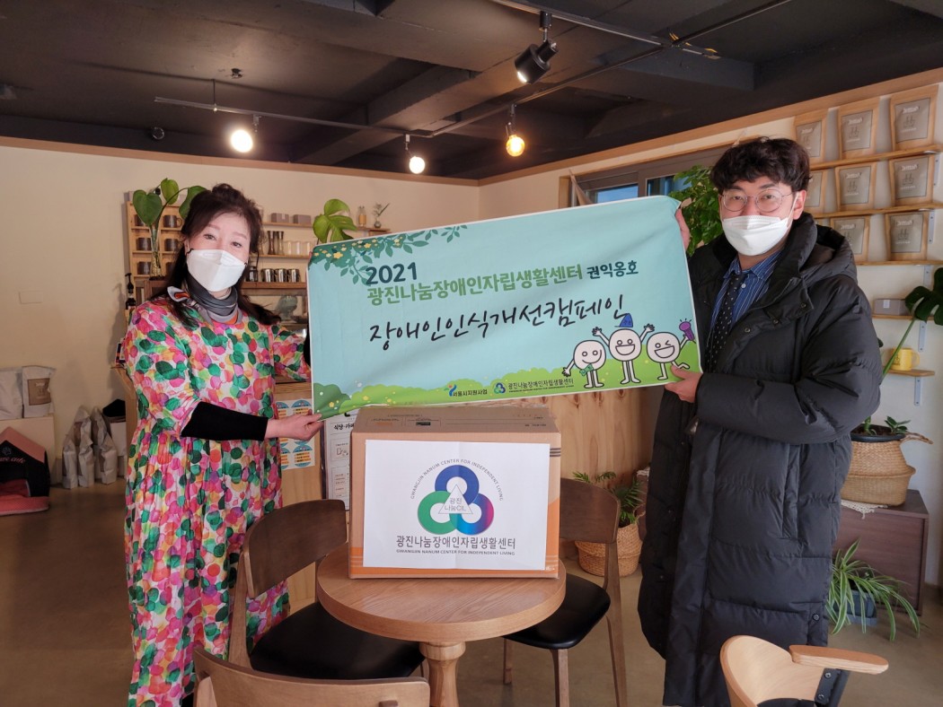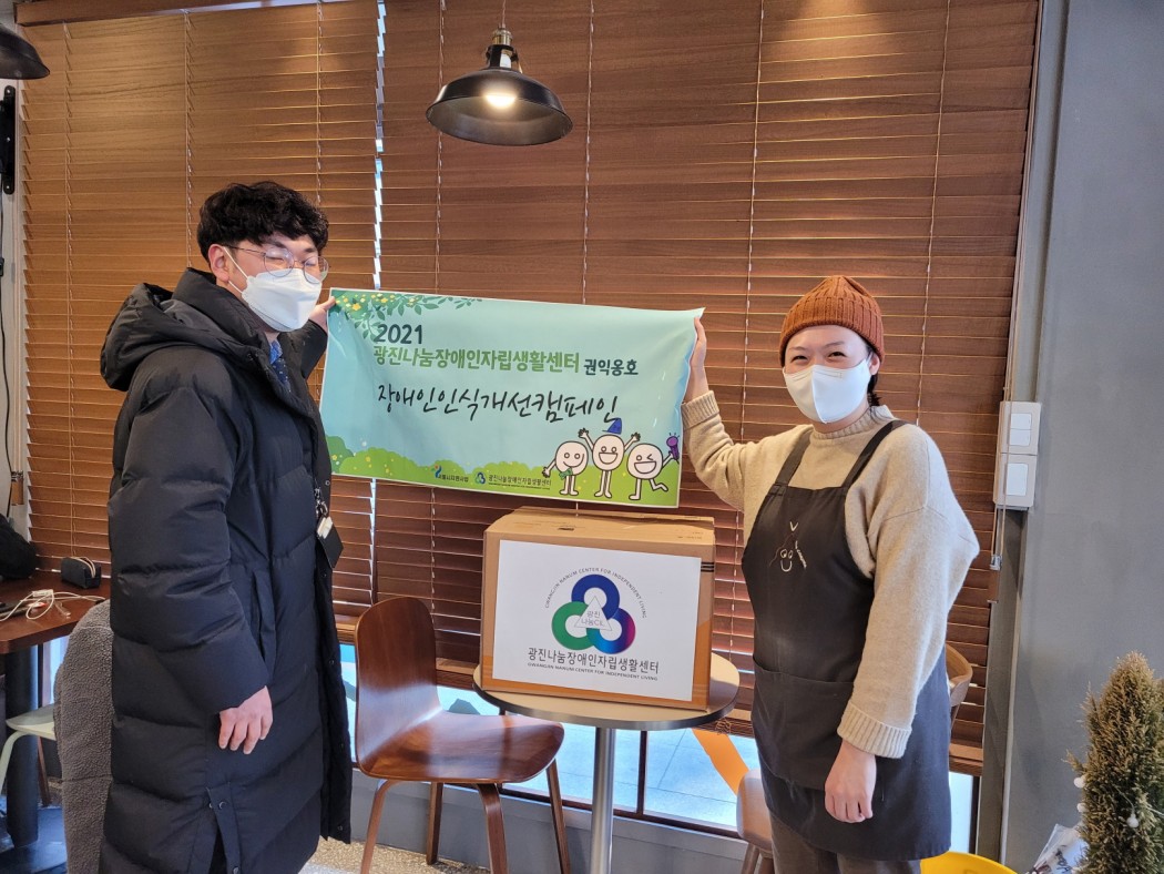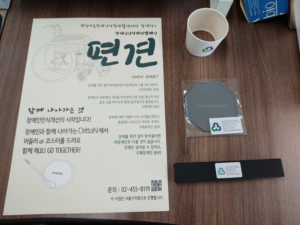 2021년 장애인인식개선캠페인 '편견아 사라져라' 관리자 0 495 2021.12.31 16:06 광진구 개인 카페 감성OO, 더 OO, 드리탄OO 외 6곳 총 9곳과 연계되어 장애인에 대한 인식 개선을 위해 특별제작한 컵홀더 1,000개를 주문하여 배포하였습니다. 장애인식개선을 위해 협조해주신 9개의 카페에 감사드립니다