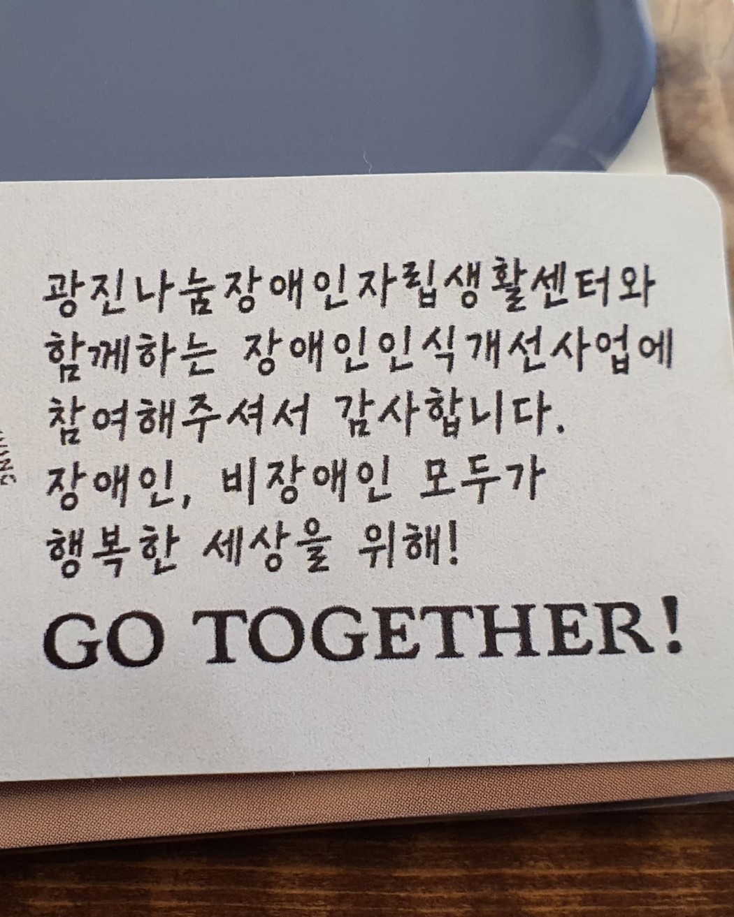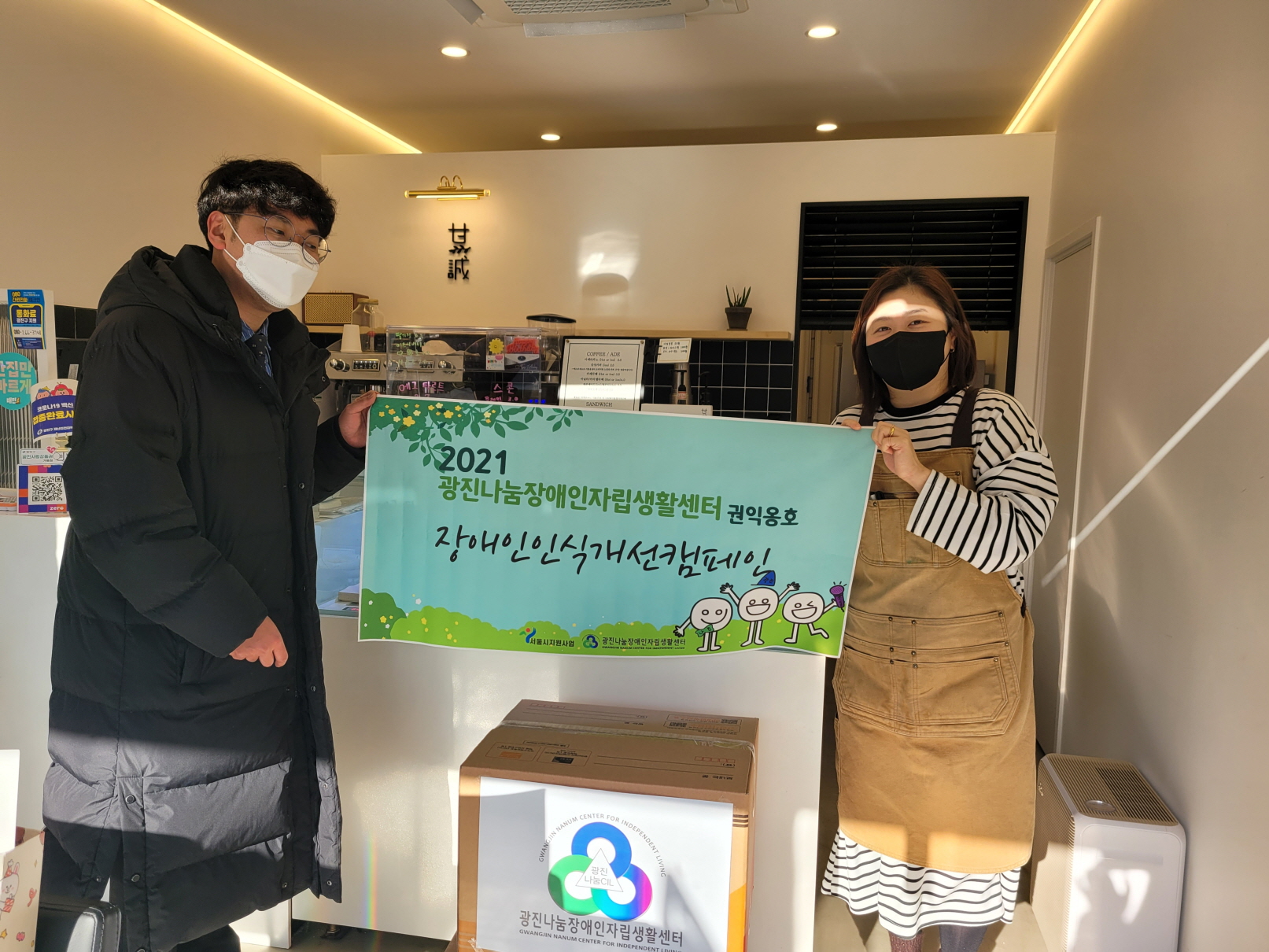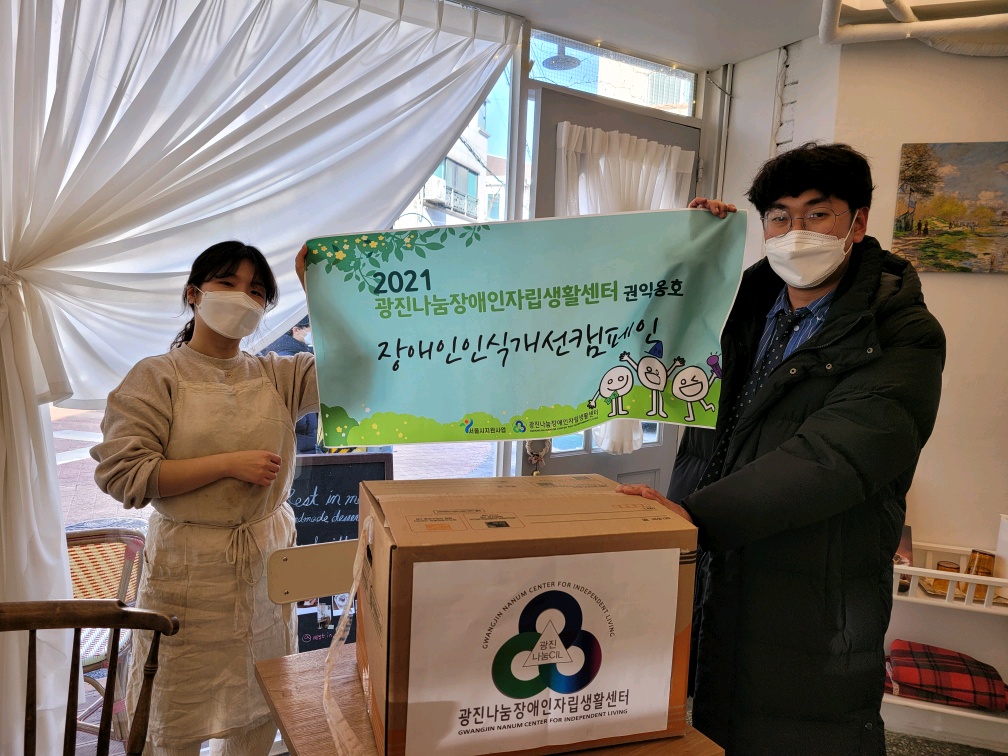 2021년 장애인인식개선캠페인 '편견아 사라져라' 관리자 0 495 2021.12.31 16:06 광진구 개인 카페 감성OO, 더 OO, 드리탄OO 외 6곳 총 9곳과 연계되어 장애인에 대한 인식 개선을 위해 특별제작한 컵홀더 1,000개를 주문하여 배포하였습니다. 장애인식개선을 위해 협조해주신 9개의 카페에 감사드립니다