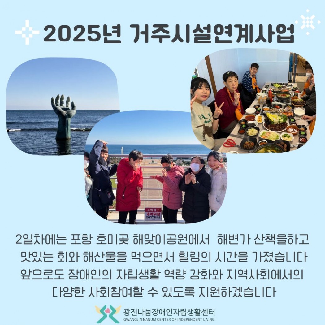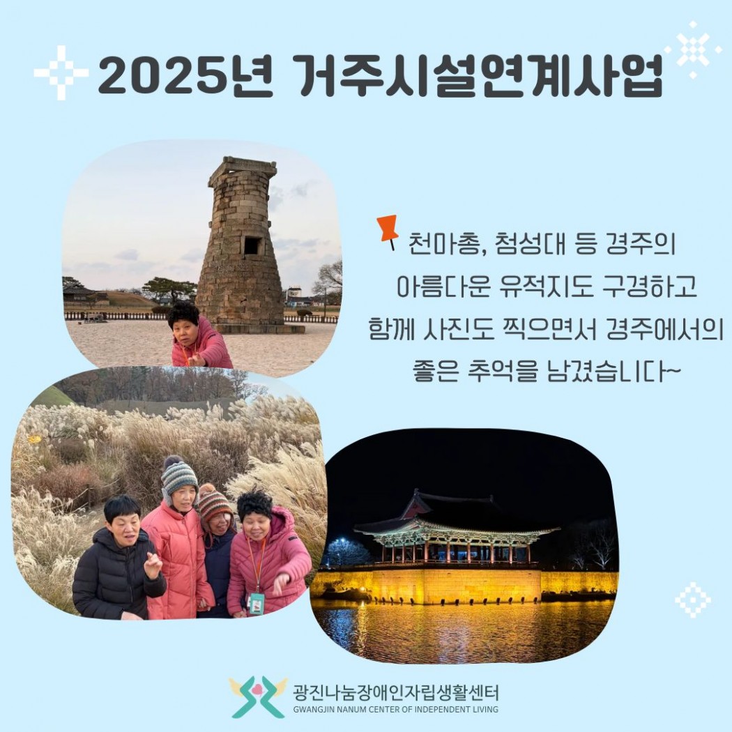 2025년 거주시설연계사업 최고관리자 0 104 2025.12.05 17:06 2025년 거주시설연계사업으로 임마누엘집과 함께 경주-포항 여행에 다녀왔습니다장애인의 자립생활을 위해 노력하겟습니다