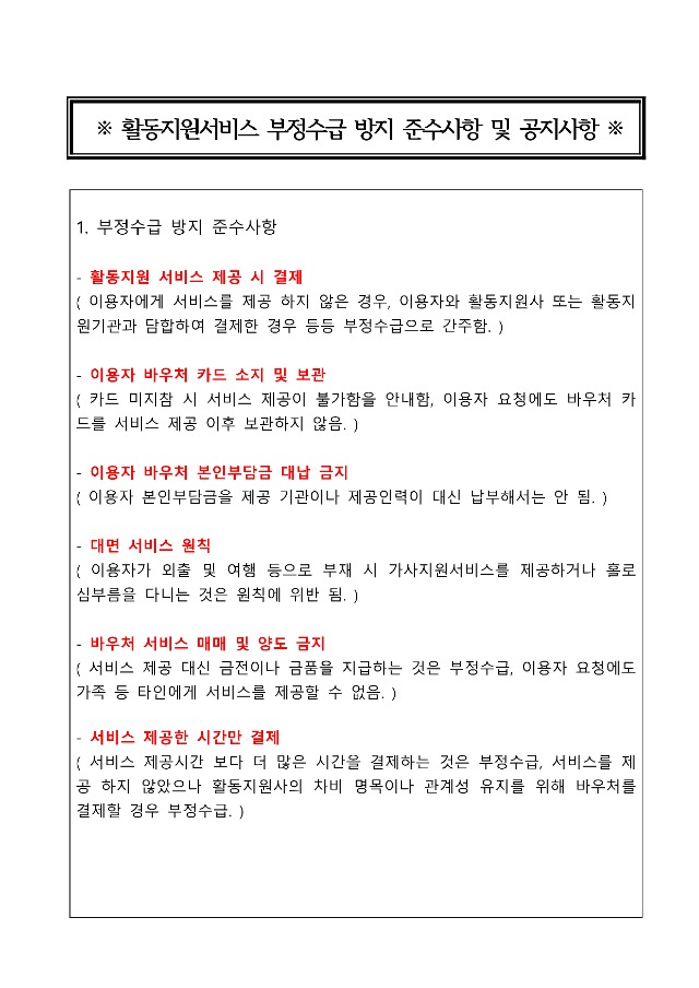 공지사항-활동지원서비스 부정수급 방지 및 준수사항 관리자 0 419 2022.03.14 13:29 2025.02.18 06:19 활동지원서비스 부정수급 방지 준수사항 및 공지사항.hwp (26.5K) + 9 활동지원서비스 부정수급 방지 준수사항 및 공지사항입니다. 서비스 진행시 참고하여 주시기 바랍니다. 감사합니다.